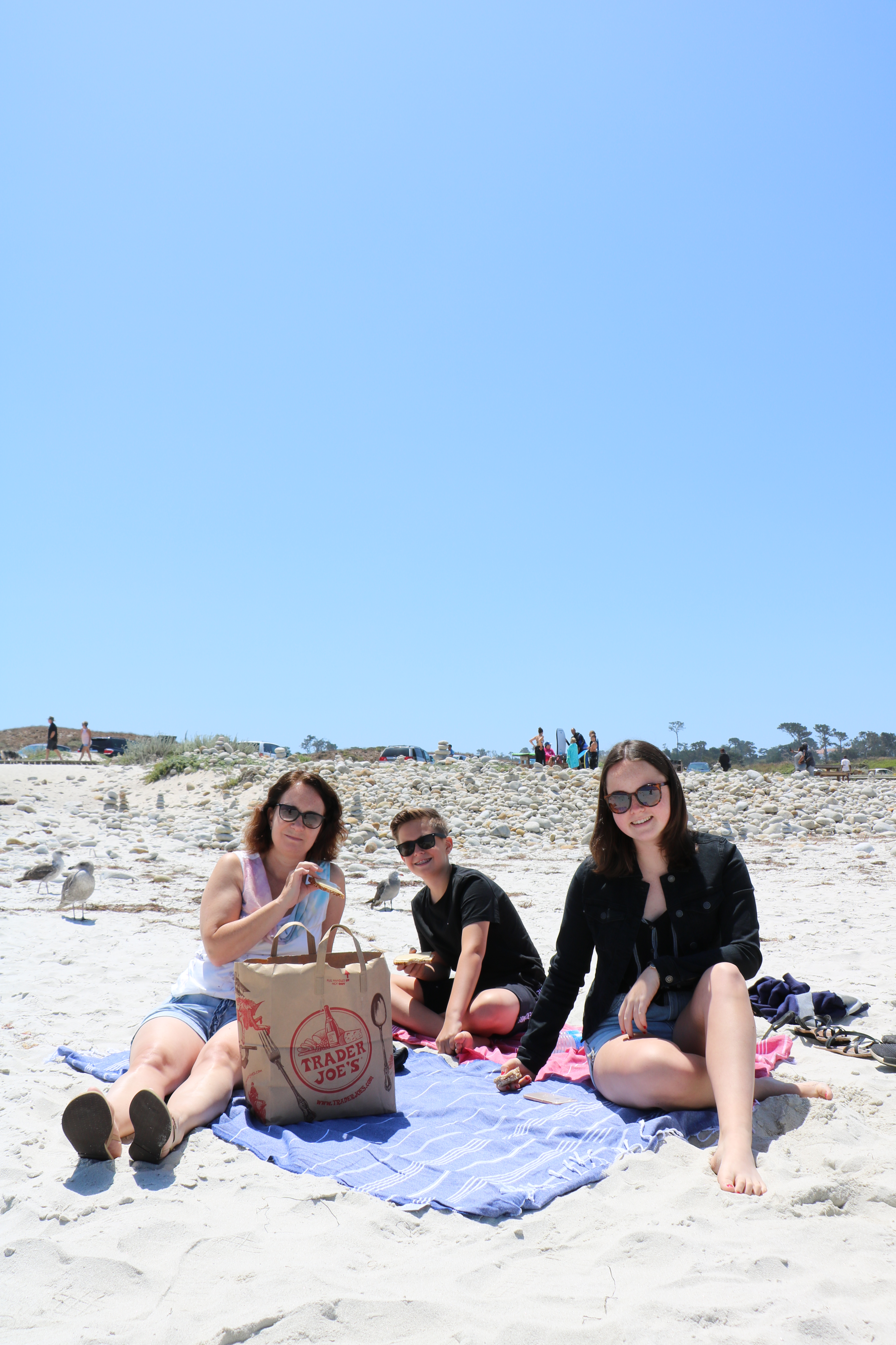 Vandaag lunchen wij op het strand bij de 17 mile drive onder de toeziende ogen van een aantal brutale zeemeeuwen die azen op ons eten. Onze lunch is een mix van boterhammen, fruit, chips en chocoladepudding.