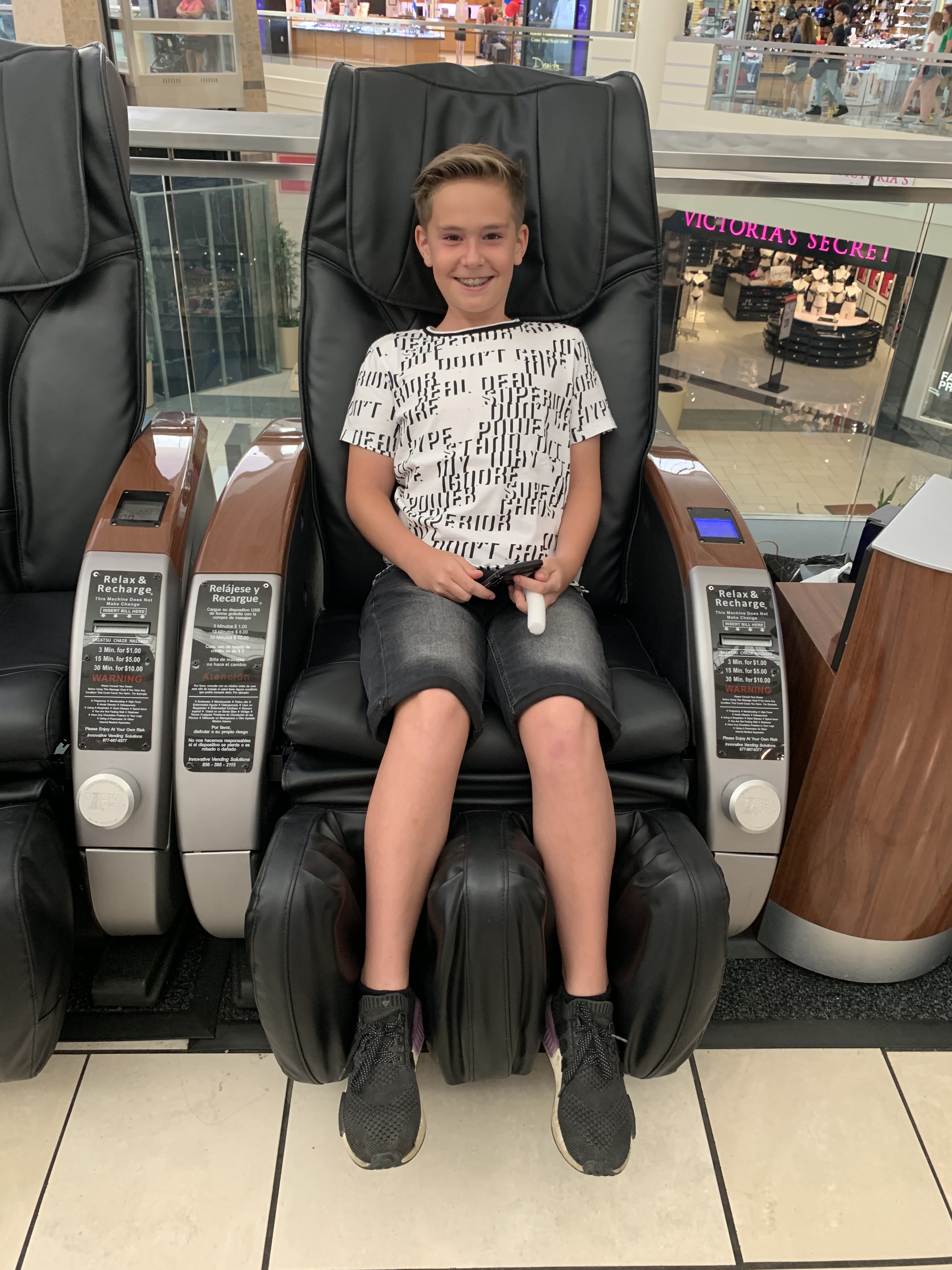Omdat winkelen niet tot de meest favoriete bezigheden van Noah behoort, hebben wij hem in een massagestoel voor één van de winkels gezet.
