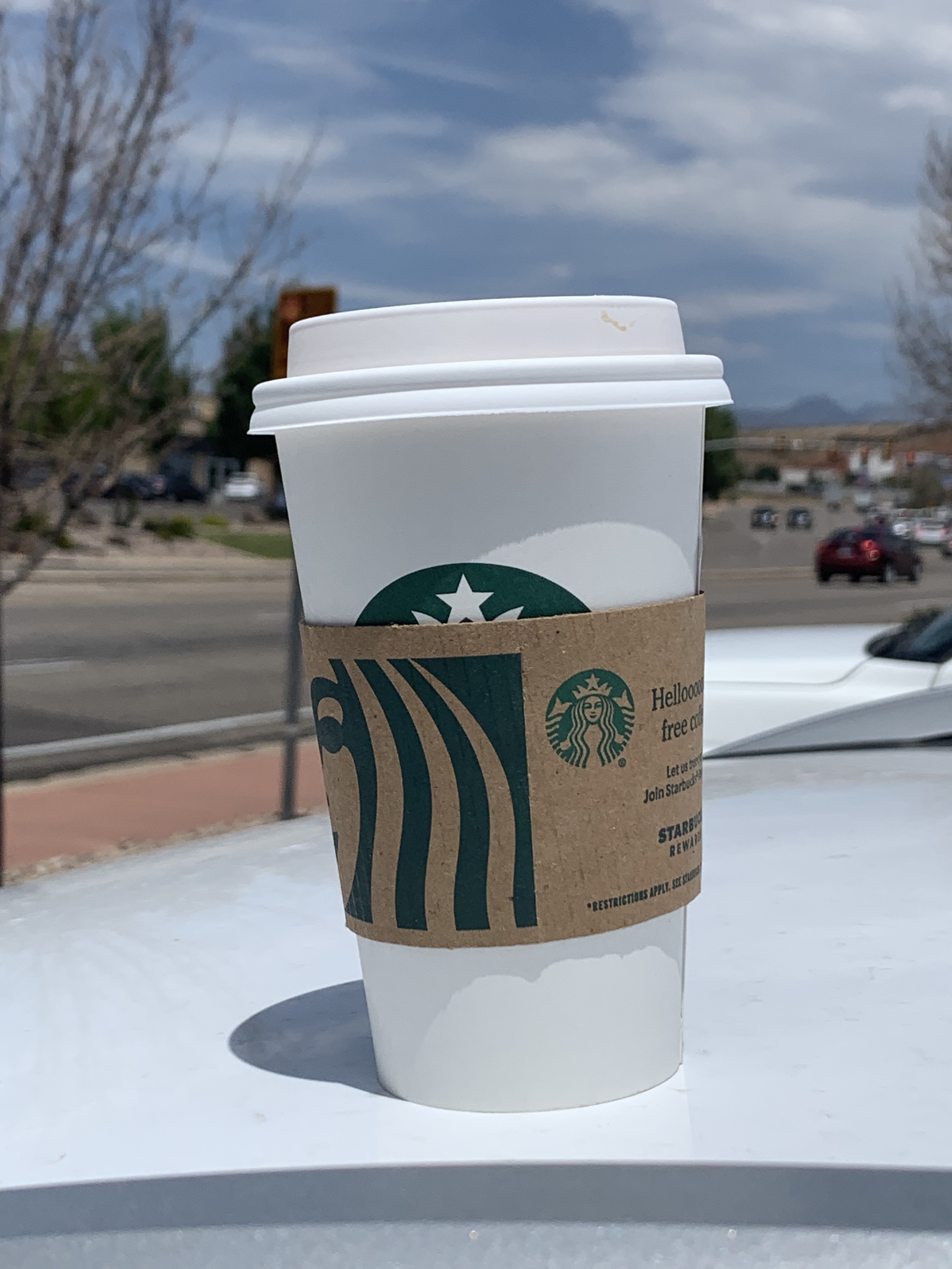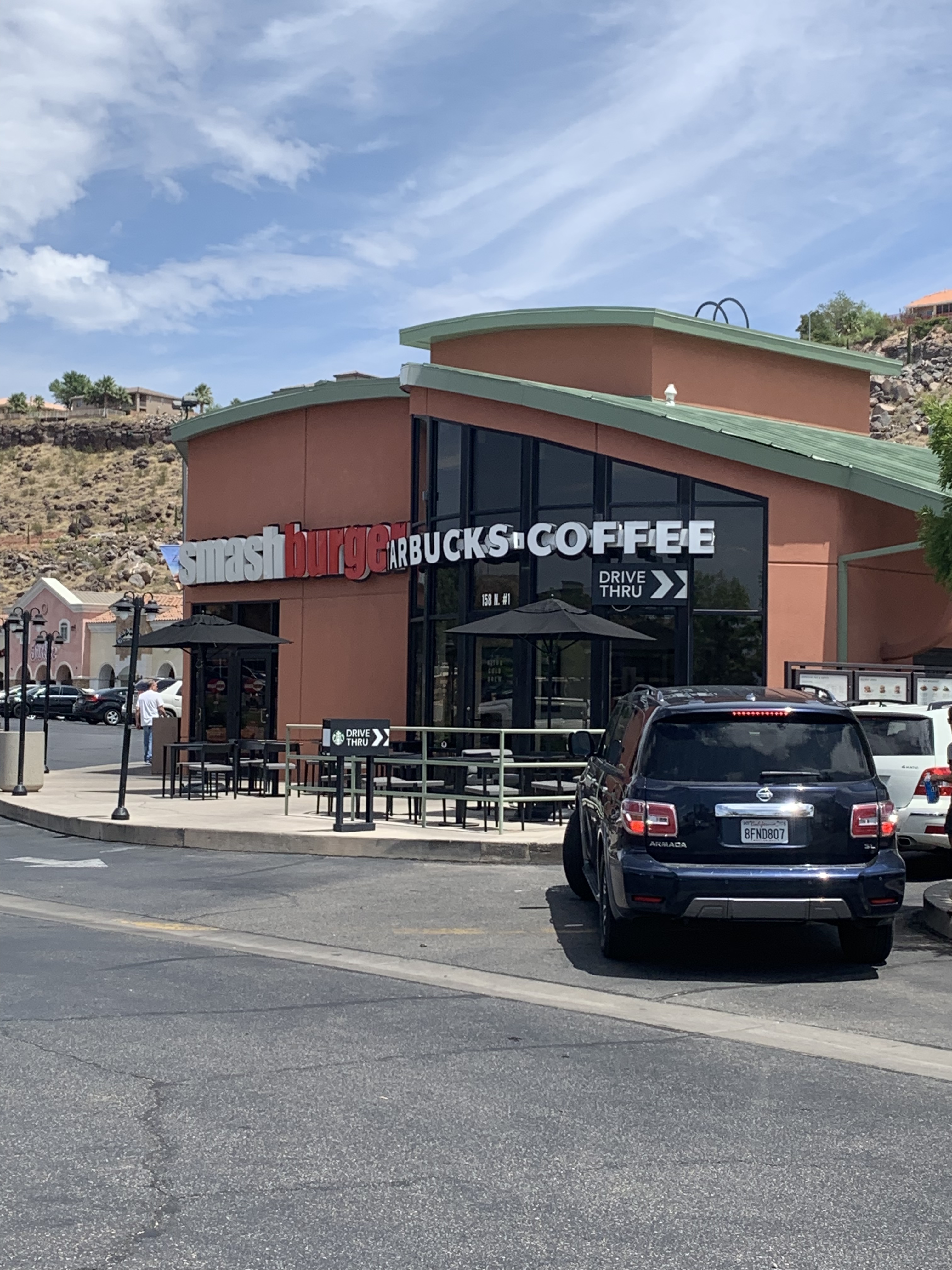 Rond het middaguur beginnen Angelique en ik afkickverschijnselen te krijgen. Er moet koffie in en als je dichtbij de bewoonde wereld bent dan is een Starbucks gelukkig nooit ver weg. Dat is nu ook het geval en wij stillen onze koffie honger met een lekkere latte in St. George. Het dynamische duo kiest voor ijsthee en ijskoffie.